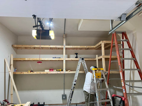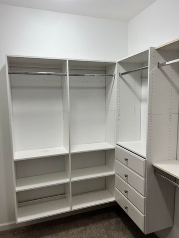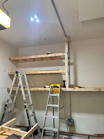 Paul reached out to us for some shelving units in their garage. But not just any shelving units. Paul had a specific request. He has a classic car that consumes the entire length of the garage so the shelving couldn’t have any legs touching the ground. We came up with a drawing and suspended the shelves from the ceiling. Paul's wife Michelle was having issues with the existing closet shelves. They needed more storage space but did not have enough room to add the appropriate amount of shelving. They weren’t looking to remodel the closet, so we came up with a solution to modify store bought shelving units for a custom solution.